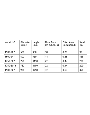 Series top-mount and side mount valve sand filters, a new generation of filament would filters designed to cover all filtration needs in pool for Residential or commercial use. The winding of fiberglass around the filter body makes the filter more durable, deforming-proof, and resistance to chemical and corrosive. Filters include 6-way valve fixed with and pressure gauge. Supplied with winter drain cap and “V” clamp, ST.ST. screw’s. The filters range is top mounted and available in 20”, 24”, 30”, 36” and 42” diameter size. Flow rate given for filtration speed =50 meter cubed/h/meter squared. Equipped with sand emptying ᴓ 2” with models ᴓ 750 and ᴓ 900.